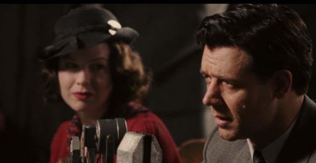 The Dominant area you are focus to is towards are main character James Braddock who is in the middle of an interview process where a report for newspapers have gather to ask James questions. It’s a low key lighting for in the room its only focus on the people being interview such as or main character James, his wife, and his friend Joe Gould. And as you see the lights coming from the left side giving us a more center focus to James face. Giving the presents that he is in the spotlight. This is a close up shot because we are focused on James since he was asked the question and his response plays a big meaning to what he is fighting for. The camera is close to the actor near eye level. The angle is set to eye level so we can focus on the what James is saying. The dominant color would have to be red for we can see on James’s wife the red coat/jacket and her red lipstick color. Some other colors that stand out would be the skin tone showing a normal yet slightly light brown in James color. While his wife is looking my pale white as if she is not well. Most of the other color fit in the dull and dark to show that they are in a rough time since it is focus on being set in the time of the great depression. It’s just a standard lens is used there is no change that can be seen. After focusing on James, you do look to see his wife next to him. And she appears in focus enough to see is a little uneasy. Would say Moderate because in the scene it focuses is of two people James and his wife and well enough you can just see his wife which shows it’s more to James focus. For you see part of his suit and the fact he is well dress and clean up. It’s divided into two showing a distance on the left side and close up on the right. Where you see that James’s, wife is soft focus because as we can see on her face, she is in support of her husband but is uncomfortable and nervous. Where she doesn’t like what her husband is doing. This is a closed scene inside a room that is very closed off so there is not much light and noise coming from the outside. Tight framing with a little space the character can just barely move around and is just in one spot while they are surrounded by reporters. Its two depths one you got James’s wife in the back. In the front you got just the top part of the microphone and James to show he is the one talking. Being the main focus in this scene. The Characters occupy the edges. I would say that because it’s to show the importance of the two characters and to show the time of year it’s set in since it follows a person going through the great depression. The character is a 3-quarter turn to the camera. Giving us a 3 point of view of his face almost being a profile. Where we see his wife giving us a full front facing the camera. They are at a personal distance from each other because even though they are married they are in a public space and in an interview process.